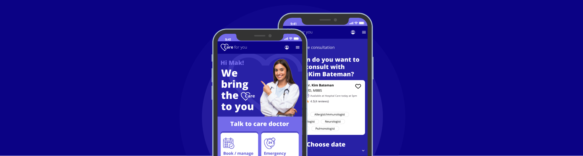 Care for You is a mobile healthcare companion that connects patients with nearby hospitals, specialists, labs, and pharmacies, all from one place. The app was designed around a single principle: the right care should take less effort to find than the wrong one. The end-to-end booking flow was refined to just 6 taps across 3 screens, reducing friction at every step.